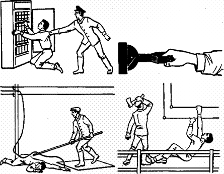 Спасение пострадавшего от поражения током во многом зависит от того, как быстро он будет освобожден от соприкосновения с токоведущим проводом и насколько квалифицированно при этом ему будет оказана первая помощь. Никогда не нужно отказываться от помощи пострадавшему и считать его погибшим на основании внешних признаков — отсутствие пульса и дыхания. По прошествии короткого времени, исчисляемого первыми минутами, изменения в организме обратимы и пострадавшего еще можно спасти. Прикосновение к токоведущим частям под напряжением вызывает у пострадавшего судорожное сокращение мышц, пальцы рук сжимаются и если он держался рукой за провод, то самопроизвольно отпустить его не сможет. Оказывающий помощь должен быстро отключить ток, но если это не удается, то отделить пострадавшего от токоведущих частей, используя при этом непроводящие предметы, например, доски, сухую одежду (рис. 12). При этом нельзя прикасаться к непокрытым одеждой частям тела пострадавшего. В случае затруднения такого отделения провод можно перерубить топором с сухим деревянным топорищем или перерезать ножом с изолированной рукояткой.