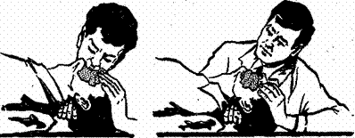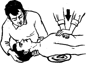 Рис. 14. Прием непрямого массажа сердца Предпочтительным является проведение искусственного дыхания методом изо рта в рот. При этом надо положить одну руку под шею пострадавшего, а другую на лоб, зажав ноздри большим и указательным пальцами. Затем нужно плотно прижать рот к открытому рту пострадавшего и вдохнуть в него воздух (рис. 13). Вдыхать надо резко с частотой 12 дыханий в минуту и до тех пор, пока грудь пострадавшего начнет заметно подниматься. Если пульс на сонной артерии не прощупывается, то немедленно надо сделать наружный массаж сердца. При этом пострадавшему (если он лежит на мягком) под грудную клетку кладут твердый плоский предмет. Затем прямыми руками резко нажимают на нижнюю часть груди (рис. 14) в ритме примерно 60 толчков в минуту. Если массаж производится правильно, то зрачки у пострадавшего должны сузиться, кожа порозоветь и при каждом надавливании на грудную клетку можно на сонной артерии прощупать пульс. О восстановлении деятельности сердца судят по появлению у пострадавшего не поддерживаемого массажем регулярного пульса. После появления первых признаков оживления наружный массаж сердца и искусственное дыхание продолжают в течение 5—10 минут, приурочивая вдувание к моменту свободного вдоха. Дополнительной полезной мерой является удержание в приподнятом состоянии от пола ног пострадавшего на протяжении всего времени оживления. При вызове врача следует предупредить, что произошло, чтобы он взял с собой приспособления, длительно поддерживающие кровообращение и дыхание. Date: 2015-07-23; view: 797; Нарушение авторских прав |