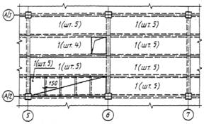 4. Схема расположения ферм (балок). 5. Схема расположения панелей стен и перегородок. 3.3.3. Схему расположения выполняют в виде планов, фасадов или разрезов соответствующих конструкций, с упрощенным изображением элементов. 3.3.4. На схему расположения наносят: 1) координационные оси здания (сооружения), размеры, определяющие расстояния между ними и между крайними осями, размерную привязку осей или поверхностей элементов конструкций к координационным осям здания (сооружения) или, в необходимых случаях, к другим элементам конструкций, другие необходимые размеры; 2) отметки наиболее характерных уровней элементов конструкций; 3) позиции (марки) элементов конструкций; 4) обозначения узлов и фрагментов; 5) данные о допустимых монтажных нагрузках. 3.3.5. Одинаковые позиции (марки) последовательно расположенных элементов конструкций на схеме расположения, допускается наносить только по концам ряда с указанием количества позиций. 3.3.6. Схему расположения панелей стен при многоярусном расположении панелей в пределах этажа выполняют в плоскости стен на виде, при однородном расположении — в плане. 3.3.7 В наименовании схем расположения, при необходимости, приводят сведения, определяющие положение конструкции в здании (сооружении). Допускается схемам расположения присваивать порядковые номера. Пример: Схема расположения элементов перекрытия на отм. 7,200 между осями 1—15, В—Г (схема 1). 3.3.8. На схеме расположения наносят метки для установки в проектное положение элементов конструкций, имеющих несимметричное расположение закладных изделий и другие отличительные признаки. Примеры выполнения схем расположения элементов сборных конструкций приведены в приложении 10. 3.3.9 Если монолитная железобетонная конструкция состоит из нескольких элементов (балок, плит и др.), на каждый из которых выполняют отдельные схемы армирования, то этим элементам присваивают позиционные обозначения или марки в соответствии с черт. 1.