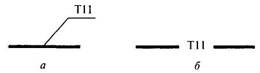4.9 Условные графические изображения основного подъемно-транспортного оборудования принимают по ГОСТ 21.112 и выполняют в масштабе чертежа. Подъемно-транспортное оборудование, условные графические изображения которого в указанном стандарте не приведены, изображают упрощенно по аналогии, учитывая конструктивные особенности конкретного оборудования. 4.10 При изображении трубопровода на чертеже (схеме) буквенно-цифровые обозначения указывают на полках линий-выносок в соответствии с рисунком 2 а и (или) в разрывах линий трубопроводов в соответствии с рисунком 2 б.