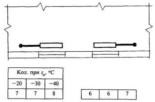 На фрагментах планов, разрезов и узлах (выносных элементах) пересечение трубопроводов без соединения, а также трубопроводы, расположенные друг над другом в одной плоскости и выполненные условными графическими обозначениями (в одну линию), изображают в соответствии с рисунком 9. 6.1.8 На планах и разрезах чертежей систем наносят и указывают: - координационные оси здания (сооружения) и расстояния между ними (для жилых зданий - расстояния между осями секций); - строительные конструкции, технологическое оборудование, имеющее местные отсосы, а также пограничные (соседние) другие инженерные коммуникации и оборудование, влияющие на прокладку трубопроводов (воздуховодов) систем; - отметки чистых полов этажей и основных площадок; - размерные привязки установок систем, воздуховодов, основных трубопроводов, технологического оборудования, неподвижных опор и компенсаторов к координационным осям или элементам конструкций здания (сооружения); - обозначения систем (установок систем); - буквенно-цифровые обозначения трубопроводов; - диаметры (сечения) воздуховодов и трубопроводов; - количество секций радиаторов, количество и длину ребристых труб, количество труб в регистре и длину регистра из гладких труб или обозначение регистра, а также обозначение (тип) по другим отопительным приборам; - обозначения стояков, компенсаторов, горизонтальных ветвей систем отопления. На планах, кроме того, указывают наименования помещений (типы помещений - для жилых зданий) и категории помещений по взрывопожарной и пожарной опасности (в прямоугольнике размером 5´8 мм), а на разрезах - отметки уровней осей трубопроводов и круглых воздуховодов, низа прямоугольных воздуховодов, опорных конструкций установок систем, верха выхлопных воздуховодов вытяжных систем. Допускается наименования помещений и категории помещений по взрывопожарной и пожарной опасности приводить в экспликации помещений по форме 2 ГОСТ 21.501. Примеры выполнения планов и разрезов чертежей систем приведены в приложении В. 6.1.9 В типовых проектах (типовых проектных решениях) зданий и сооружений для двух и более расчетных температур наружного воздуха и (или) для двух и более этажей номер этажа, расчетную температуру наружного воздуха, данные по отопительным приборам, указанным на планах, приводят в таблице (рисунок 10). При наличии на чертеже нескольких таблиц допускается наименование граф приводить только на одной из них (рисунок 11). В типовых проектах (типовых проектных решениях) зданий и сооружений для двух и более расчетных температур наружного воздуха диаметры трубопроводов, при необходимости, указывают в таблице.