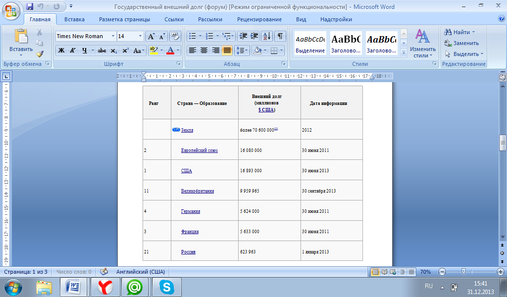 Ни для кого, ни секрет, что для обеспечения функционирования любого государства, нужен крепкий тыл, в виде бюджета, который пополняется в основном за счет разнообразных налогов. Однако, не всегда возможно государству себя обеспечить самому, и в этом случае оно принимает решение о займе денежных средств у другого автономного государства (иностранного источника), непременно в иностранной валюте. И именно, государственные внешние заимствования РФ называются - государственный внешний долг Российской Федерации. Мы хотим рассмотреть более структурировано внешний долг в РФ. Эта тема кажется нам актуальной из-за того, что Российская Федерация является крупной державой с огромным запасом ресурсов, но все же ей приходится брать долги для обеспечения своим гражданам хорошие условия жизни в РФ и свести на нет миграцию населения. Внешний дог в нашей стране можно охарактеризовать, как сравнительно не большой. Однако, мы считаем что стоит уже задуматься серьезно об этой, на наш взгляд проблеме, т.к. прекрасно осознаем, что долг РФ увеличивается. Конечно, не в такой сильной прогрессии как в других странах (табл. 1), однако еще в 2011 году наш долг составлял 538 600 000 000 $, а в 2012 году он вырос до таких значений, как 623 963 0000 000 000 $. Поэтому мы и считаем тему своевременной и необходимой для дальнейшего исследования. Кроме того, для урегулирования задолженности на общегосударственном уровне необходим серьезный анализ структуры долга, анализа факторов влияющих на него. И конечно же составления прогнозов на будущее.