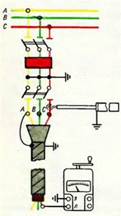 Проверка чередования фаз силовых кабелей. Простейшим способом отыскания в конце кабеля токоведущих жил, соответствующих определенным фазам его начала, является способ проверки ("прозвонки") жил при помощи телефонных трубок, например при проверке силовых кабелей, прокладываемых между различными помещениями станций и подстанций. В качестве одного из проводов для установления связи используют заземленные конструкции (заземленную металлическую оболочку кабеля), к которым подсоединяют телефонные трубки. Далее, с одной из сторон кабеля провод от батарейки соединяют с токоведущей жилой (допустим, фазой С), С другой стороны кабеля вторым проводом от телефонной трубки поочередно касаются токоведущих жил, каждый раз подавая голосом сигнал в трубку. Найдя жилу, по которой будет получен отзыв проверяющего, ее помечают как фазу С и в том же порядке продолжают поиск других жил. Вместо телефонных трубок в последнее время стали применять телефонные гарнитуры, которые освобождают руки проверяющих для работы.