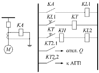 На промышленных предприятиях довольно широко применяются мощные синхронные двигатели, которые так же. как и АД должны иметь защиты: - от междуфазных КЗ - от замыканий на землю, - защиту минимального напряжения, - защиту от перегрузки. Первая особенность защит СД – они должны действовать не только на отключение выключателя двигателя, но и на АГП, если он имеется. Варианты осуществления АГП: - введение сопротивления R в цепь обмотки возбуждения возбудителя (Р Д < 2 МВт), - введение сопротивления R в цепь обмотки возбуждения (Р Д > 2 МВт), - если СД оборудован тиристорной системой возбуждения, то АГП обеспечивается самой системой возбуждения. Вторая особенность защит СД – дополнительно СД оснащаются защитой от выпадения из синхронизма. Причинами выпадения СД из синхронизма могут быть: - снижение напряжения в сети (КЗ, резкое увеличение нагрузки, ошибочные коммутации), - уменьшение тока возбуждения СД ниже допустимого предела или обрыв в цепи возбуждения, - увеличение нагрузки на приводимом механизме. Традиционный способ выполнения защиты СД от потери синхронизма – фиксация периодических колебаний тока статора. Такая защита может быть выполнена с помощью токового реле, действующего на выключатель и АГП с выдержкой времени. Так как ток, проходящий в СД пульсирует, то токовое реле КА будет то срабатывать, то возвращаться. Чтобы исключить размыкание контактов реле времени КТ, в схему вводят дополнительное исполнительное реле KL 1 с задержкой на размыкание контакта.
