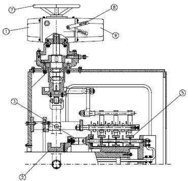 После того, как двигатель выйдет на рабочую скорость, проводится процедура замыкания контактных колец, включающая устройство подъема и замыкания (1), или, альтернативно, включается тормозной двигатель (9), или вручную поворачивается маховик (7). Замыкание производится через скользящую щетку (2) с серебряными контактами (3). После этого включается механизм подъема щеток (4). После полного подъема щеток устройство автоматически отключается с помощью переключателя CCE. OBS.: 1) Автоматическая система подъема щеток поставляется в комплекте с системой защиты от перегрузок для включения тормозного двигателя (9) через моментные выключатели с отключением при опускании (CLD) или подъеме щеток (CLE).