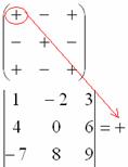 Сравните два решения. Нетрудно заметить, что это ОДНО И ТО ЖЕ, просто во втором случае немного переставлены множители формулы, и, самое главное, вероятность допустить ошибку значительно меньше. Теперь рассмотрим шесть нормальных способов для вычисления определителя Почему нормальных? Потому-что в подавляющем большинстве случаев определители требуется раскрывать именно так. Как Вы заметили, у определителя «три на три» три столбца и три строки. Определитель матрицы равен сумме произведений элементов строки (столбца) на соответствующие алгебраические дополнения. Страшно? Все намного проще, будем использовать ненаучный, но понятный подход, доступный даже для человека, далекого от математики. В следующем примере будем раскрывать определитель по первой строке. Внимание! Матрица знаков – это мое собственное изобретение. Данное понятие не научное, его не нужно использовать в чистовом оформлении заданий, оно лишь помогает Вам понять алгоритм вычисления определителя. Сначала я приведу полное решение. Снова берем наш подопытный определитель и проводим вычисления: