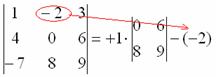 5) Затем записываем второй элемент: 6) МЫСЛЕННО вычеркиваем строку и столбец, в котором стоит второй элемент: Ну и третий элемент первой строки. Никакой оригинальности: 7) Из матрицы знаков выписываем соответствующий знак: 8) Записываем третий элемент: 9) МЫСЛЕННО вычеркиваем строку и столбец, в котором стоит третий элемент: Остальные действия не представляют трудностей, поскольку определители «два на два» мы считать уже умеем. НЕ ПУТАЕМСЯ В ЗНАКАХ! Аналогично определитель можно разложить по любой строке или по любому столбцу. Естественно, во всех шести случаях ответ получается одинаковым. Определитель «четыре на четыре» можно вычислить, используя этот же алгоритм.