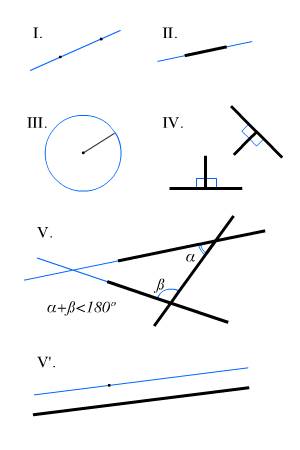 АКСИОМАТИЧЕСКИЙ МЕТОД ПОСТРОЕНИЯ ГЕОМЕТРИИ ЕВКЛИД («Начала», 300 лет до н.э.) «Определения» базовых понятий: 1. Точка есть то, что не имеет частей. (Σημεῖόν ἐστιν, οὗ μέρος οὐθέν — букв. «Точка есть то, часть чего ничто») 2. Линия — длина без ширины. 3. Края же линии — точки. 4. Прямая линия есть та, которая равно лежит на всех своих точках. 5. Поверхность есть то, что имеет только длину и ширину. 6. Края же поверхности — линии. 7. Плоская поверхность есть та, которая равно лежит на всех своих линиях. За определениями Евклид приводит постулаты (I post. 1-5): 1. От всякой точки до всякой точки можно провести прямую. 2. Ограниченную прямую можно непрерывно продолжать по прямой. 3. Из всякого центра всяким раствором может быть описан круг. 4. Все прямые углы равны между собой. 5. Если прямая, пересекающая две прямые, образует внутренние односторонние углы, меньшие двух прямых, то, продолженные неограниченно, эти две прямые встретятся с той стороны, где углы меньше двух прямых. За постулатами следуют аксиомы (I ax. 1-9), которые имеют характер общих утверждений, относящихся в равной мере как к числам, так и к непрерывным величинам: 1. Равные одному и тому же равны и между собой. 2. И если к равным прибавляются равные, то и целые будут равны. 3. И если от равных отнимаются равные, то остатки будут равны. 4. (И если к неравным прибавляются равные, то целые будут не равны.) 5. (И удвоенные одного и того же равны между собой.) 6. (И половины одного и того же равны между собой.) 7. И совмещающиеся друг с другом равны между собой. 8. И целое больше части. 9. (И две прямые не содержат пространства.) В скобки взяты аксиомы, принадлежность которых Евклиду Гейберг, автор классической реконструкции текста «Начал», счёл сомнительной. I post. 4 и 5 в ряде списков выступают как I ax. 10 и 11 соответственно.