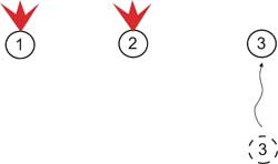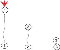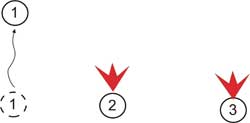 (b) Вариант №2 «Два - один» Применяется последовательное передвижение: двое стреляют - один бежит. Некоторые специалисты предлагают перемещаться без строгой последовательности — кто после кого вскакивает и меняет позицию, для того, чтобы у противника не было возможности угадать, кто из членов «тройки» будет перемещаться следующим. Данное предложение хорошо, но велика вероятность возникновения путаницы, и на наш взгляд более приемлем поочерёдный способ, но со сменой первого перемещающегося. Например, бежит №1, а №2 и №3 прикрывают. Следующий перемещается №2, №1 и №3 на прикрытии. Наконец вперёд уходит №3 под прикрытием №1 и №2. Первый этап закончился, вся группа переместилась вперёд. Начало второго этапа начинается с движения вперёд уже №2, затем №3 и заканчивается перемещением №1. Третий этап начинает №3, потом №1, завершает №2 и т.д. Здесь возможны варианты, и в каждом подразделении желательно наработать что-то свое, но главное условие простота и понятность, что бы, не возникло путаницы в бою.