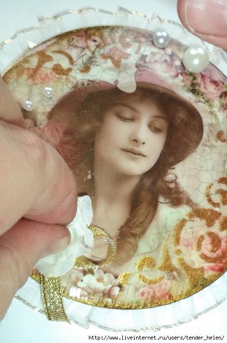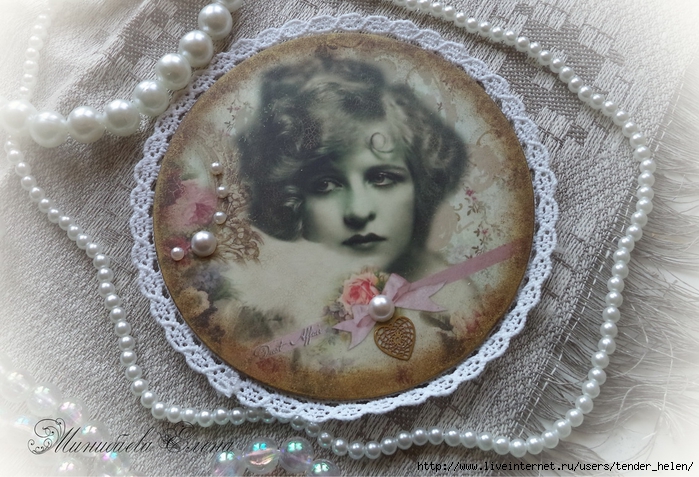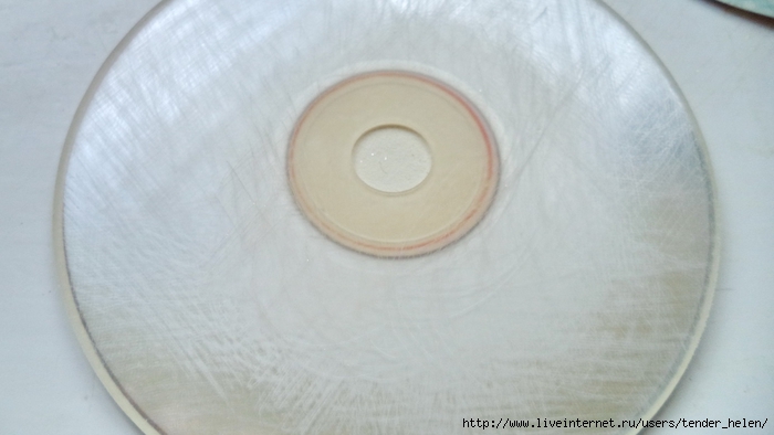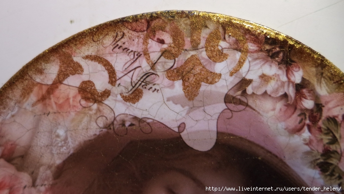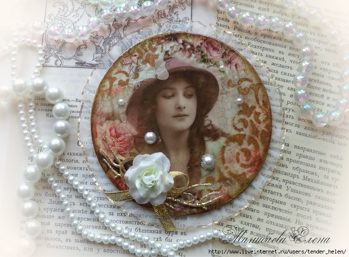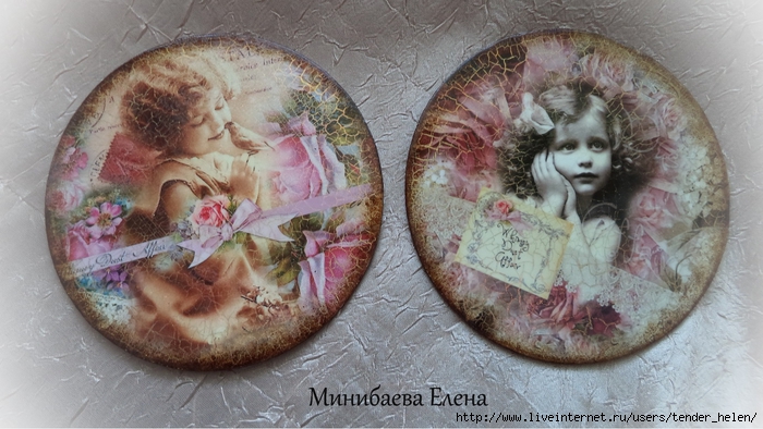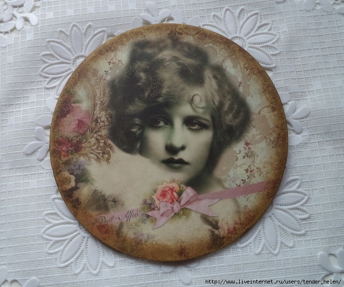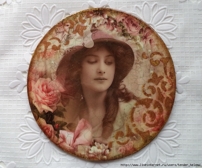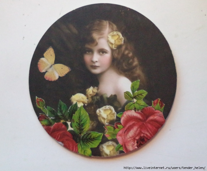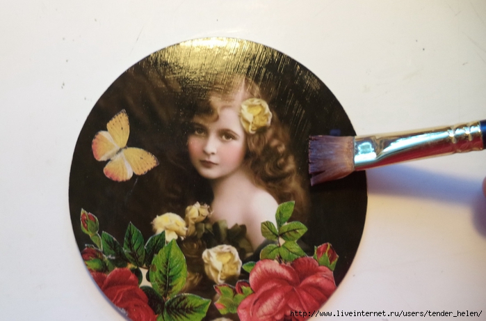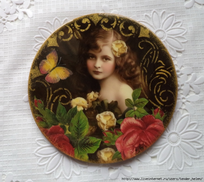 Теперь берём плотную красивую бумагу-- у меня это виниловые обои с красивым винтажным рисунком! Обводим круг. Можно взять плотную скраповую бумагу, она тоже хорошо подойдёт! Вырезаем круг по диску. Я делаю сразу несколько дисков, поэтому картинки на них разные. Намазываем скраповую бумагу и диск клеем ПВА строительным (густым) И приклеиваем их. Прокатываем валиком, чтоб лучше приклеилось. То же самое я сделала и с обоями и диском. К стати говоря, с виниловыми обоями мне больше понравилось. Они плотнее и их не выворачивает при просыхании как скраповую бумагу. Но не переживайте, когда окончательно всё высыхает, всё становится ровненьким. Да и у обоев объём красивый и не требуется покрытия лаком. А скраповую бумагу надо потом обязательно лакировать... Хорошо просушить наш "сэндвич" и можно пройти по краю шкуркой, чтоб лишнее на крае не оставалось. Вот они ровненькие и ошкуренные по краю. Ну а теперь самое ответственное! Дырочку в диске надо заполнить, я это делаю обычной шпатлёвкой. Делаем это не толсто, а почти вровень с диском. И ждём высыхания! Как высохнет, то надо за шкурить. Но шпатлёвка усохла и есть неровность, поэтому наносим ещё немного выравнивая. На фото неровность видно. Выровняли, просушили и хорошо прошкурили. А потом загрунтовали на пару раз. Я увлеклась процессом и забыла сфотать промежуточный этап... Диски в результате получаются очень ровными. Не шлифуйте на весу, чтоб не рас трескать серединку, а на столе. Выбираем винтажные картинки на свой вкус, кому как нравится. Мне понравились коллажи с фото девушек и розами! Распечатала на фото бумаге на обычном струйном принтере с водными чернилами. Можно использовать и декупажные карты и салфетки. Кому как нравится! Лакируем наши распечатки. У меня лак "Лакра". Нанесла 4 слоя с промежуточной просушкой. Наносила их крест накрест для большего сцепления слоёв лака. Просушить. И можно истоньшать распечатку. Я замачиваю распечатку на 20-30 минут и начинаю обратную сторону бумаги скатывать. Здесь уже бумагу скатала. Распечатка готова. Намазываю распечатку и диск клеем ПВА и приклеиваю их друг к другу. Прокатываю валиком, чтоб вышел весь воздух. Просушить и покрыть несколько слоёв акрилового лака с промежуточным шкурением через каждые 3-5 слоёв. Добиваемся гладкости. Можно нанести двух шаговый кракелюр. На этом магните у меня ARS Hobby (мелкий) В трещинках пастель. Здесь Маймери 753-754 В трещинках пастель. Здесь Кракле Медиум фирмы "Стамперия" Выбор в кракелюрах велик, можно выбирать на вкус. Здесь в трещинках белая пудра используемая для ногтей с радужным переливом. Эффект очень понравился, под разным углом отливает разными красками. А можно совсем без кракелюра... Здесь распечатку дополнила декупажной картой с розочками, вырезала и наклеила... И бабочка вписалась, как будто тут и была... Покрыла лаком, сделала на бабочке и розах прорисовку. Через трафарет нанесла золотую краску.