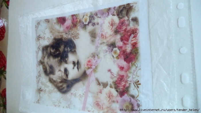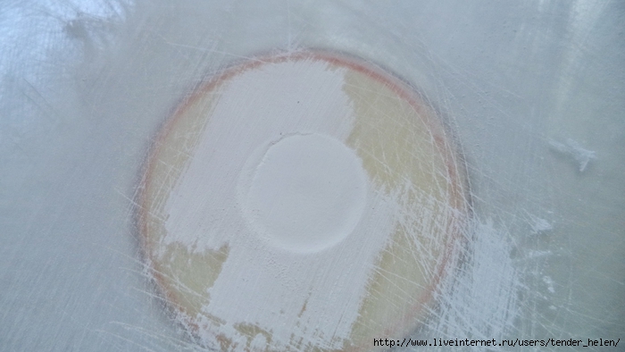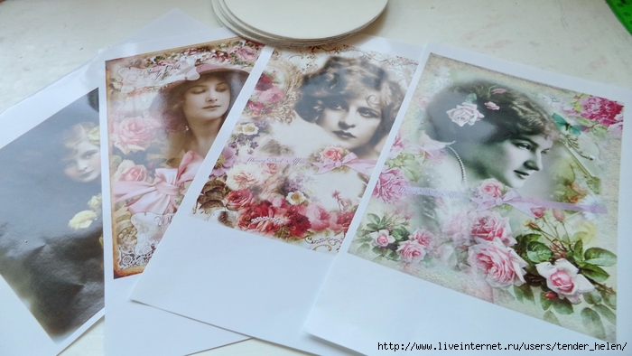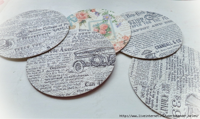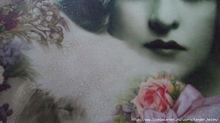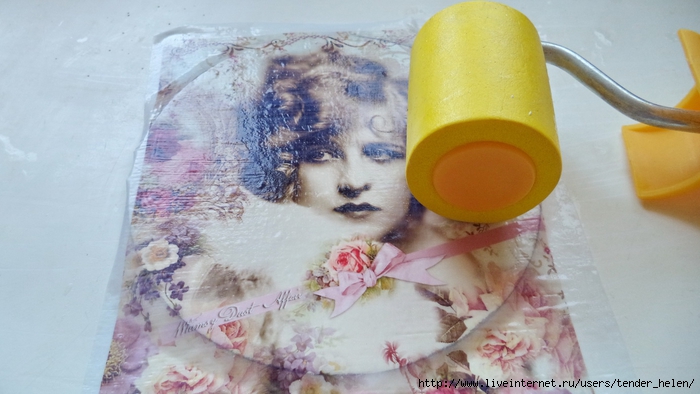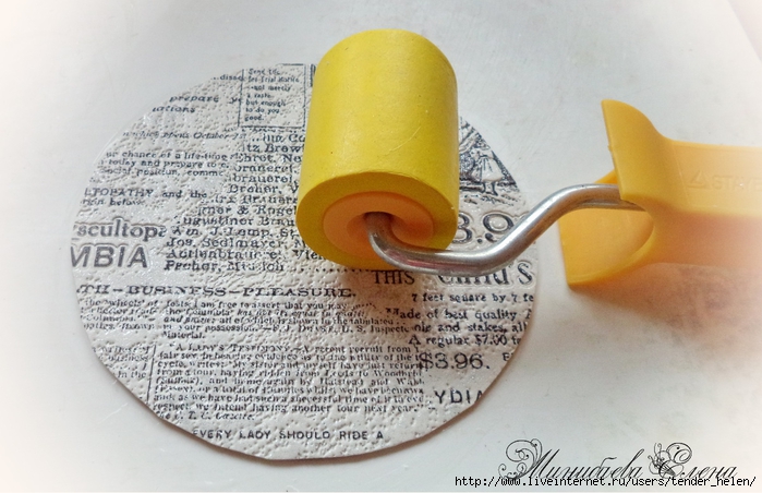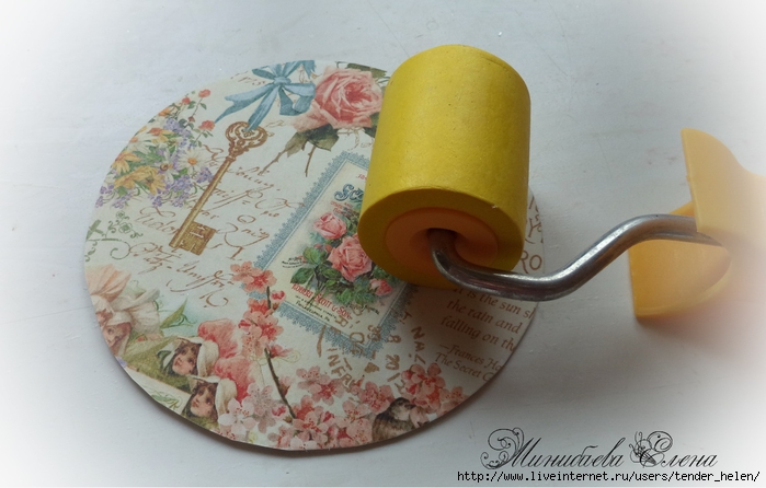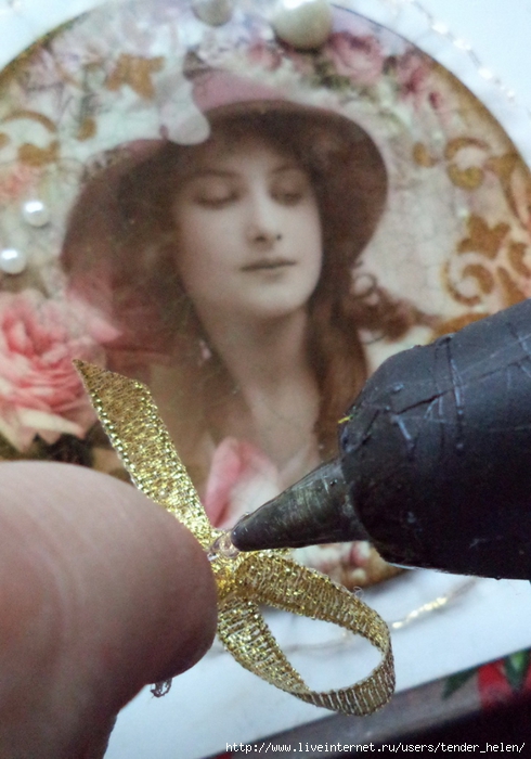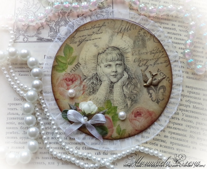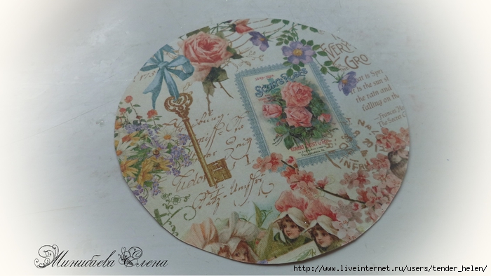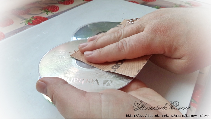 Теперь берём плотную красивую бумагу-- у меня это виниловые обои с красивым винтажным рисунком! Обводим круг. Можно взять плотную скраповую бумагу, она тоже хорошо подойдёт! Вырезаем круг по диску. Я делаю сразу несколько дисков, поэтому картинки на них разные. Намазываем скраповую бумагу и диск клеем ПВА строительным (густым) И приклеиваем их. Прокатываем валиком, чтоб лучше приклеилось. То же самое я сделала и с обоями и диском. К стати говоря, с виниловыми обоями мне больше понравилось. Они плотнее и их не выворачивает при просыхании как скраповую бумагу. Но не переживайте, когда окончательно всё высыхает, всё становится ровненьким. Да и у обоев объём красивый и не требуется покрытия лаком. А скраповую бумагу надо потом обязательно лакировать... Хорошо просушить наш "сэндвич" и можно пройти по краю шкуркой, чтоб лишнее на крае не оставалось. Вот они ровненькие и ошкуренные по краю. Ну а теперь самое ответственное! Дырочку в диске надо заполнить, я это делаю обычной шпатлёвкой. Делаем это не толсто, а почти вровень с диском. И ждём высыхания! Как высохнет, то надо за шкурить. Но шпатлёвка усохла и есть неровность, поэтому наносим ещё немного выравнивая. На фото неровность видно. Выровняли, просушили и хорошо прошкурили. А потом загрунтовали на пару раз. Я увлеклась процессом и забыла сфотать промежуточный этап... Диски в результате получаются очень ровными. Не шлифуйте на весу, чтоб не рас трескать серединку, а на столе. Выбираем винтажные картинки на свой вкус, кому как нравится. Мне понравились коллажи с фото девушек и розами! Распечатала на фото бумаге на обычном струйном принтере с водными чернилами. Можно использовать и декупажные карты и салфетки. Кому как нравится! Лакируем наши распечатки. У меня лак "Лакра". Нанесла 4 слоя с промежуточной просушкой. Наносила их крест накрест для большего сцепления слоёв лака. Просушить. И можно истоньшать распечатку. Я замачиваю распечатку на 20-30 минут и начинаю обратную сторону бумаги скатывать. Здесь уже бумагу скатала. Распечатка готова. Намазываю распечатку и диск клеем ПВА и приклеиваю их друг к другу. Прокатываю валиком, чтоб вышел весь воздух. Просушить и покрыть несколько слоёв акрилового лака с промежуточным шкурением через каждые 3-5 слоёв. Добиваемся гладкости. Можно нанести двух шаговый кракелюр. На этом магните у меня ARS Hobby (мелкий) В трещинках пастель. Здесь Маймери 753-754 В трещинках пастель. Здесь Кракле Медиум фирмы "Стамперия" Выбор в кракелюрах велик, можно выбирать на вкус. Здесь в трещинках белая пудра используемая для ногтей с радужным переливом. Эффект очень понравился, под разным углом отливает разными красками. А можно совсем без кракелюра... Здесь распечатку дополнила декупажной картой с розочками, вырезала и наклеила... И бабочка вписалась, как будто тут и была... Покрыла лаком, сделала на бабочке и розах прорисовку. Через трафарет нанесла золотую краску.