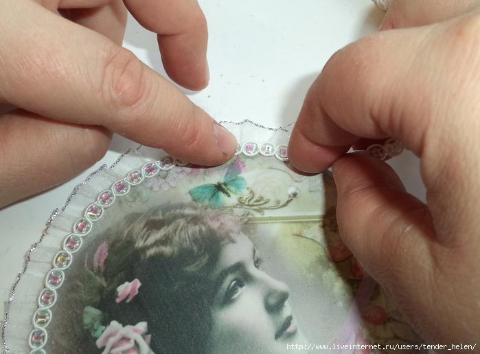 Здесь по краю пошла тесьма. Цвет у неё отливает несколькими красками, чем хорошо сочетается с картинкой.