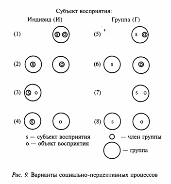 Процесс общения может быть эффективным только в случае взаимопонимания между его участниками. Само взаимопонимание может быть здесь истолковано по-разному: или как понимание целей, мотивов, установок партнера по взаимодействию, или как не только понимание, но и принятие, разделение этих целей, мотивов, установок. Однако и в том, и в другом случаях большое значение имеет то, как воспринимается партнер по общению, иными словами, процесс восприятия одним человеком другого выступает как обязательная составная часть общения и условно может быть назван перцептивной стороной общения. Часто восприятие человека человеком обозначают как «социальная перцепция». Этот термин впервые был введен Дж. Брунером в 1947 г. для обозначения социальной детерминации перцептивных процессов. Позже социальной перцепцией, стали называть процесс восприятия социальных объектов, под которыми подразумевались другие люди, социальные группы, большие социальные общности. Именно в этом употреблении термин закрепился в социально-психологической литературе. Поэтому восприятие человека человеком относится, конечно, к области социальной перцепции, но не исчерпывает ее. Процессы социальной перцепции включают в себя различные варианты не только объекта, но и субъекта восприятия. Когда субъектом восприятия выступает индивид, то он может воспринимать другого индивида, принадлежащего к «своей» группе (1); другого индивида, принадлежащего к «чужой» группе (2); свою собственную группу (3); «чужую» группу (4). Когда в качестве субъекта восприятия интерпретируется не только отдельный индивид, но и группа, Тогда процессы социальной перцепции включают еще: восприятие группой своего собственного члена (5); восприятие группой представителя другой группы (6); восприятие группой самой себя (7), наконец, восприятие группой в целом другой группы (8). Каждый из обозначенных «случаев» исследуется в социальной психологии, но не все из них имеют отношение к проблеме взаимопонимания партнеров по общению (Андреева).
