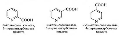 Пиридинкарбоновые кислоты в результате электроноакцепторного влияния атома азота являются более сильными кислотами, чем бензойная. Кислотность α- и γ-пиридинкарбоновых кислот выше, чем β-кислоты, так как в α- и γ-пиридинкарбоновых кислотах карбоксильная группа находится в сопряжении с атомом азота, что приводит к усилению ее депротонизации. Никотиновая кислота и ее амид (никотинамид) известны в медицине как провитамин витамина PP. При недостатке витамина РР развивается заболевание кожи — пеллагра, поэтому его называют антипелларгическим. N,N-Диэтиламид никотиновой кислоты под названием кордиамин (25% — водный раствор) применяется как средство, стимулирующее центральную нервную систему. Схема синтеза амида и N,N-диэтиламида никотиновой кислоты: