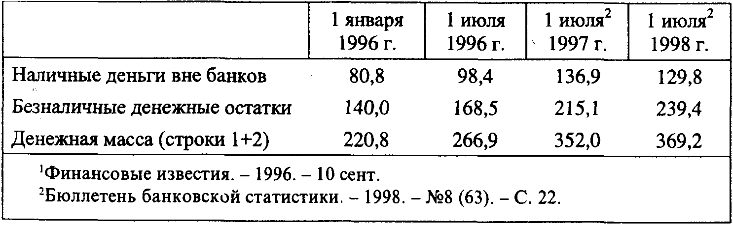 Единство денег безналичного оборота и наличных денег обусловило возможность рассмотрения их как совокупности в виде денежной массы, под которой понимается совокупный объем наличных денег и денег безналичного оборота. В Федеральном законе «О Центральном банке РФ» от 12 апреля 1995 г. предусмотрено следующее: «Банк России может устанавливать ориентиры роста одного или нескольких показателей денежной массы...» (ст. 43). Важно подчеркнуть, что речь идет о совокупной величине денежной массы, включающей деньги безналичного оборота и наличные деньги. Различия между безналичными денежными расчетами и безналичным оборотом, который совершается с помощью передачи ценных бумаг, проявляется и в том, что в состав денежной массы в обращении не входят ценные бумаги. Денежная масса в обращении характеризуется величиной денежного агрегата M2, в состав которого включаются наличные деньги в обращении М0 (сумма наличных денег в обращении вне банков, т.е. за вычетом остатков в кассах банков, а также остатки средств в национальной валюте на расчетных, текущих счетах и депозитах нефинансовых предприятий, организаций и физических лиц, являющихся резидентами РФ. В этот агрегат не включаются депозиты в иностранной валюте). Сравнительно недавно в РФ для характеристики величины денежной массы стал применяться показатель М2Х, в состав которого помимо величины М2 включаются также все виды депозитов в иностранной валюте (в рублевом эквиваленте - X). При этом для характеристики относительной обеспеченности оборота денежной массой используется коэффициент К2 =М2Х/ВВП. Величина этого коэффициента (К2) призвана характеризовать относительную обеспеченность оборота платежными средствами. В РФ величина К2 в 1995 г. составила 0,16, в то время как в других (развитых) странах его величина достигает 0,6-1,0. Это свидетельствует об относительно невысокой обеспеченности оборота платежными средствами в РФ, что косвенно проявляется в росте неплатежей в хозяйстве, задержках в выдаче заработной платы и пенсий. Совокупный объем денежной массы, в том числе и ее прирост, во многом определяется увеличением абсолютных размеров кредита банков. С этой стороны величина денежной массы в обращении представляет собой результат денежно-кредитной политики. В РФ структура денежной массы характеризуется сравнительно большим удельным весом наличных денег, который достигает в отдельные периоды 35% ее совокупного объема, что намного больше, чем в развитых странах. Поэтому по мере развития безналичных расчетов будет улучшаться и структура денежной массы в направлении уменьшения доли наличных денег и повышения удельного веса денег безналичного оборота. Для характеристики объема и слагаемых денежной массы в РФ приведем следующие данные.