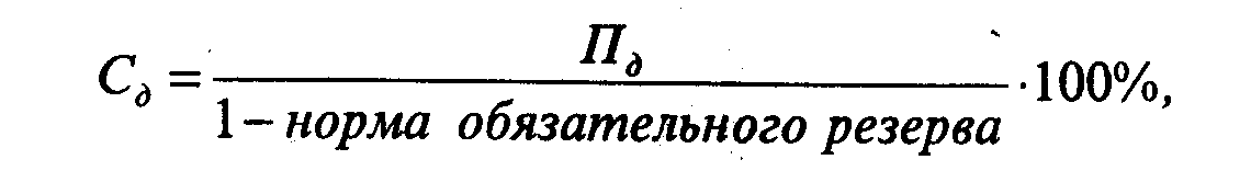 где: С1 - средняя реальная цена всех кредитных ресурсов на планируемый период; С2 - отношение планируемых расходов по обеспечению функционирования банка к ожидаемому объему продуктивно размещенных средств; Пм - планируемый уровень прибыльности ссудных операций банка с минимальным риском. Средняя реальная цена кредитных ресурсов (C1) определяется по формуле средневзвешенной арифметической исходя из цены отдельного вида ресурсов и его удельного веса в общей сумме мобилизуемых банком (платных и бесплатных) средств. Средняя реальная цена отдельных видов ресурсов определяется на основе рыночной номинальной цены указанных ресурсов и корректировки на норму обязательного резерва, депонируемого в Центральном банке РФ. В частности,
