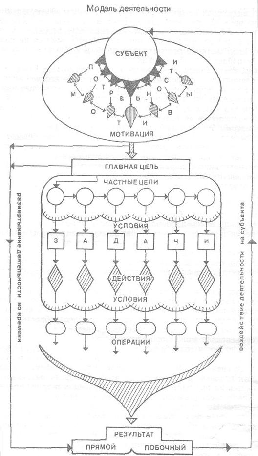 Соотнесение каждой подцели с конкретными условиями ее достижения образует задачи, которые возникают одна за другой по мере осуществления деятельности. По сути дела, решение задач является механизмом осуществления деятельности. Это решение осуществляется с помощью действий, которые, так же как и деятельность, выполняются в определенных условиях. Поэтому действия также имеют свою ориентировочную основу. Побуждающей силой любого действия является доминирующий мотив деятельности, в состав которой входит то или иное действие. Однако каждое действие может иметь свои дополнительные мотивы. Это условие даже является желательным. Заметим, что в психологической литературе нет четкого разграничения понятий деятельность и действие. Часто в научной литературе можно встретить слово действие, а в скобках после него как синоним указывается слово деятельность, и наоборот. В некоторых случаях абсолютно очевидно, какой термин необходимо использовать. Никто, например, говоря о процессе учения в целом, не скажет «учебные действия»; это учебная деятельность. Точно так же простые и очевидные освоенные действия, например, вычисления по формулам, решение простых задач и другое нельзя назвать деятельностью. Хотя процесс освоения этих действий в свое время мог быть деятельностью. Если же речь будет идти об отдельном фрагменте занятия, то здесь часто допустимо использовать оба термина из-за нечеткого их различия. Можно сказать, что различия между деятельностью и действием количественные, но, как известно, количество переходит в качество, и деятельности присущи некоторые свойства, не характерные для действия. В то же время, деятельность поглощает все свойства действия. Действия выполняются с помощью операций, представляющих собой способы, с помощью которых совершается деятельность. Операции выполняются в определенном порядке и по определенным правилам и опираются на средства осуществления деятельности. Эти средства имеют принципиальное значение, и проектирование деятельности – это, по сути дела, проектирование ее средств. И понятно, что эти средства должны соотноситься с целью. Из пушки по воробьям не стреляют. Одна цель достигается с помощью одних средств, другая – с помощью других. Средства деятельности динамичны. Выступая в данный момент как средства достижения цели, они изначально сами могут быть целями деятельности. Например, для доказательства теоремы (в учебной ли, научной деятельности) может быть необходима лемма. В этом случае лемма – это средство достижения цели. Но лемму саму необходимо доказать, и доказать раньше, чем теорему, поэтому вначале лемма – цель. В любых не учебных видах деятельности (например, в производственной, научно-исследовательской), средства деятельности совпадают со средствами решения задач, поскольку продукт решения задач совпадает с целями. В учебной же деятельности средства деятельности и средства решения задач не тождественны, поскольку здесь важен не результат решения задач (ответ), а процесс получения этого результата. Средствами решения задач любых видов деятельности могут быть материальные объекты (орудия труда, машины, инструменты, различные устройства и приспособления и др.), материализованные объекты (чертежи, схемы, карты, знаковые системы и др.), идеальные объекты (образы, знания, умения)