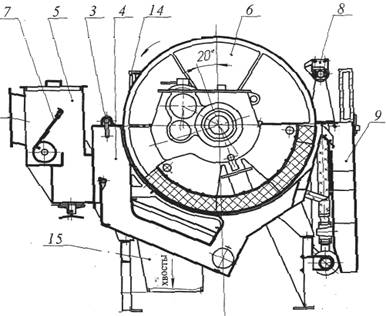 3 - жинақтауыш (коллектор); 4 - ванна; 5 - қораб; 6 - барабан; 7- ұрғыш; 8 - шаю; 9 - науа; 14- қоршау; 15 – ағып шығу 4 - сурет Сепаратор ПБМ-ПП-120/300