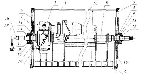 1- барабан тұрқы; 2- қақпақ; 4- люктың қақпағы; 5- мойынтірек; 6 – магнитті жүйе; 7- мотор-редуктор; 8 – шетмойын (цапфа); 9 - стақан; 10 – қаптама (футеровка); 11 - қақпақ; 12 – май сауыт (масленка);13- төлке (втулка); 14 - жартылаймуфта; 15- жарты білік (полый вал); 16 – жең (рукав); 17- айырша кабель; 18 - шетмойын (цапфа); 19 – қаптама (футеровка). 6 – сурет Барабан
