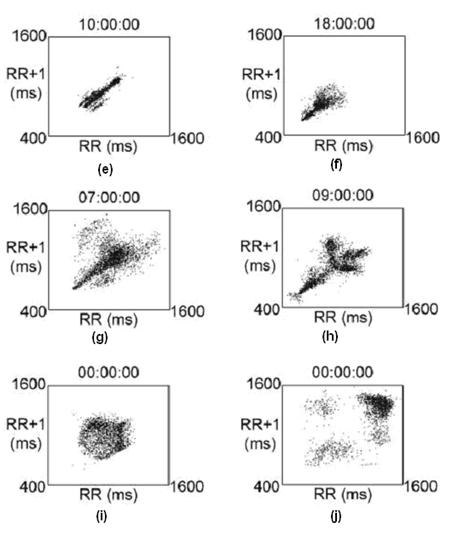 Рис. 8. Примеры графиков Пуанкаре (на картах представлены точки с координатами Ri Ri+1 и Ri+1 Ri+2 интервалов), используемые для оценки качеств последовательности RR- интервалов: графики (a)-(d) - тщательно отредактированная последовательность RR- интервалов (ритм синусовый); (e)-(j) - записи больных сердечно-сосудистыми заболеваниями (Stein P.K. и соавт., 2008)
