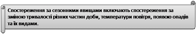 3. Яка наука вивчає сезонні зміни в живій природі? Фенелогія 4. Як називають спостереження за періодичними змінами в рослинному і тваринному світі? Фенологічні спостереження 5. Що розробили натуралісти на основі багаторічних фенологічних спостережень? Використовуючи дати багаторічних фенологічних спостережень, натуралісти становлять фенологічні календарі (календарі природи). Спостерігаючи з року в рік за одними і тими ж об'єктами і фіксуючи одні й ті ж явища, вчені ретельно записують терміни цих явищ, а потім виводять (обчислюють) середні терміни спостережуваних явищ.