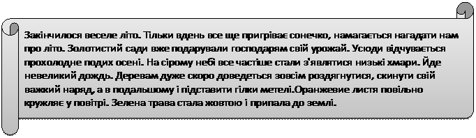 Ø Охарактеризуйте періоди осені: рання осінь - стає прохолодно, жовтіє листя, волого від дощу, птахи починають відліт в теплі краї.