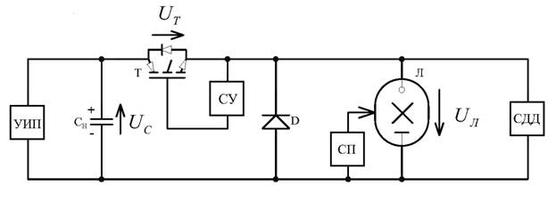 Достоинствами рассмотренной схемы являются: - возможность формирования практически прямоугольных импульсов тока накачки, которые эффективны для генерации на протяжении всего импульса; - возможность независимой регулировки амплитуды, длительности и частоты повторения импульсов тока накачки; - минимальная величина напряжения источника питания, которая равна максимальному напряжению на лампе; - возможность формирования импульсов тока накачки большой длительности (до десятков миллисекунд), что связано с отсутствием дросселя. К числу недостатков схемы следует отнести: - большую избыточную энергию накопителя, обусловленную тем, что за время импульса в лампу накачки передается не более трети запасенной в конденсаторе энергии. При этом мощность, поступающая в лампу, к концу импульса уменьшается вдвое; - невозможность использования схемы в режиме программируемого источника тока, предусматривающего быструю смену режима. Это связано с наличием заряженного конденсатора большой емкости, который непосредственно подключается к лампе; - нестабильность работы лампы в схеме при низких напряжениях на накопительном конденсаторе (большой разброс амплитуды и времени формирования фронта импульса).