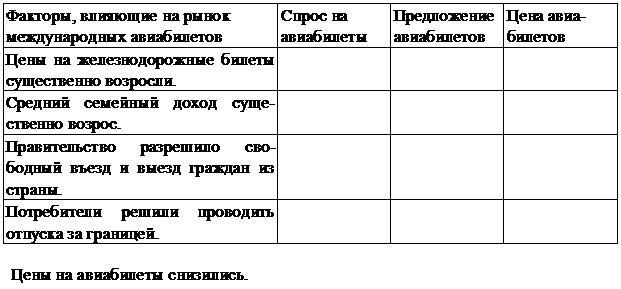 В таблице перечислены факторы, которые могут оказать влияние на рынок международных авиабилетов. Объясните направление влияния каждого фактора и отразите это в соответствующей графе, обозначив: (+) -рост; (-) - снижение; (0) - отсутствие влияния.