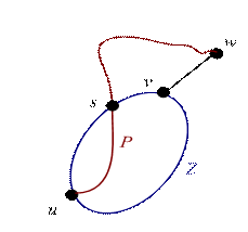 Рис. К доказательству пункта [1Þ2] теоремы о блоках [2Þ3] Пусть u – любая вершина и (v, w) – любое ребро. Вершины u и v принадлежат некоторому простому циклу Z. Если w Î Z, то требуемый цикл строится из ребра (v, w) и из того отрезка цикла Z от v до w, который содержит вершину u. Если же w Ï Z, то по следствию 2 существует простая á u, w ñ - цепь P, не содержащая вершину v. Обозначим через s первую вершину, считая от вершины w, на цепи P, которая также принадлежит циклу Z. Тогда рассмотрим следующую последовательность простых цепей: отрезок цепи P от вершины w до вершины s, отрезок цикла Z от вершины s до вершины v, содержащий вершину u, и ребро (v, w).