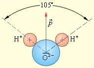 де Електричним дипольним моментом володіє, наприклад, нейтральна молекула води (H2O), оскільки центри двох атомів водню розташовуються не на одній прямій з центром атома кисню, а під кутом 105° (мал. 4). Дипольний момент молекули води p = 6,2·10–30 Кл · м.