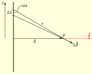 Поле в точці спостереження P може бути представлене у вигляді суперпозиції кулонівських полів, що створюються малими елементами ∆x нитки, із зарядом τ∆x, де τ заряд нитки на одиницю довжини. Завдання зводиться до підсумовування (інтеграції) елементарних полів