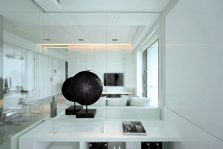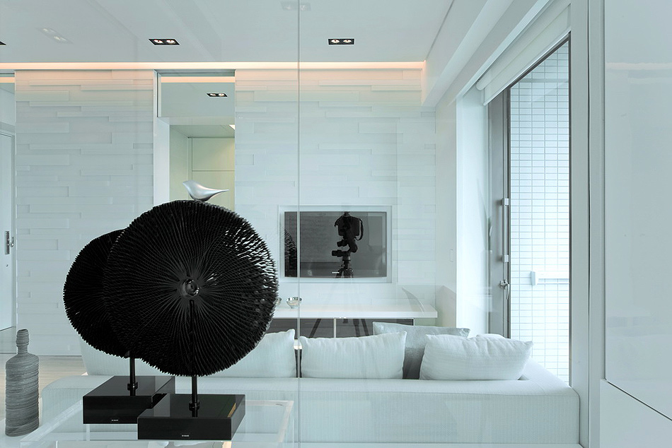 Архитектор Danny Chan из Beige Design работал над интерьером квартиры в Гонконге. Жилой комплекс расположен прямо на берегу залива Виктория. Отсюда и основная концепция дизайна – вода. В это маленькой квартире на 40 кв.м. вода повсюду. Во-первых, потрясающий вид из окна на линию горизонта, где океан и небо сливаются в бесконечность. Во-вторых, цветовое решение интерьера, в котором преобладают серебряный, белый и серый оттенки, воплощающие собой сверкающие волны.