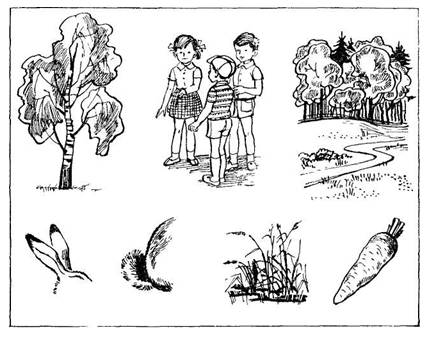 Тема. Та же. Цель. Учить детей последовательному полному пересказу с опорой на предметные картинки. Оборудование. Картинки, изображающие ветку, медведя, белку, шишку, зайца, сорок, лосей. Ход занятия. 1. Организационный момент. 2. Восстановление картинного ряда в последовательности рассказа. Логопед предлагает детям назвать картинки по порядку в последовательности рассказа. Дети называют картинки, логопед выставляет их на наборном полотне. 3. Пересказ рассказа по опорным картинкам. 4. Пересказ рассказа с опорой на перевернутые картинки (изображения дети не видят). 5. Пересказ рассказа по памяти. Задание на дом. Рассказать рассказ маме (воспитательнице). Задание. Прослушать рассказ «Зайчик». Пересказать по опорным предметным картинкам. Картинки даны вперемешку. «В живом уголке жил зайчик. Дети вместе с воспитательницей поймали его в лесу. Зайчик сидел у березки и ел травку. Зайку принесли в детский сад. Шерсть у него серенькая, ушки длинные, хвостик коротенький. Зубки и коготки острые. Зайчик всех боялся, а потом привык. Он стал грызть морковку и капусту». Задание. Прослушать рассказ «Гости». Пересказать по опорным предметным картинкам. Картинки даны вперемешку. «К Лене пришли гости. Ей шесть лет. Мама испекла сладкий пирог. Папа купил конфет и слив. Сестра подарила Лене цветы. Дети принесли игрушки и книжки. Бабушка подарила красивую чашку. Дети пели и плясали. Всем было весело».