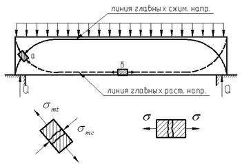 На приопорных участках под действием поперечной силы и изгибающего момента в сечениях, наклонных к продольной оси элемента, развиваются напряженно-деформированные состояния, как и в нормальных сечениях. Главные растягивающие и главные сжимающие напряжения действуют под углом к оси (рис. 36).