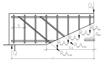Поперечные усилия Железобетонные элементы редко армируются отгибами, поэтому в частном случае Для элементов с поперечной арматурой в виде хомутов, нормальных к продольной оси элемента и имеющих постоянных шаг s в пределах рассматриваемого наклонного сечения, значение с0 соответствует минимуму выражения