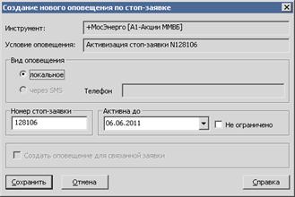 1. Поле «Инструмент» содержит наименование ценной бумаги, в отношении которой создается оповещение. 2. «Условие оповещения» – информационное поле диалога, отображающее полученное в результате настроек условие оповещения. 3. «Вид оповещения» – выбор вида оповещения: «локальное» или «через SMS». 4. Поле «Номер стоп-заявки» – ввод номера стоп-заявки. 5. Поле «Активна до» – выбор даты, до которой активно оповещение. 6. «Не ограничено» – при включенном флажке время жизни оповещения не ограничено 7. «Создать оповещение для связанной заявки» – если флажок включен, то будет создаваться оповещение в случае, если при срабатывании стоп-заявки была выставлена лимитированная заявка. Нажатием кнопки «Сохранить» новое оповещение сохраняется и активизируется. Нажатием кнопки «Отмена» окно создания оповещения закрывается без сохранения. Для быстрого создания оповещения данного типа можно из Таблицы стоп-заявок вызвать контекстное меню и выбрать команду «Оповещение по стоп-заявке» или «Sms-оповещение по стоп-заявке». Если контекстное меню было вызвано для неактивной стоп-заявки, то данная команда будет недоступна. Оповещение данного типа исполняется, когда активируется (или отменяется, в случае с sms-оповещениями) выбранная стоп-заявка. Date: 2015-07-22; view: 413; мЮПСЬЕМХЕ ЮБРНПЯЙХУ ОПЮБ |