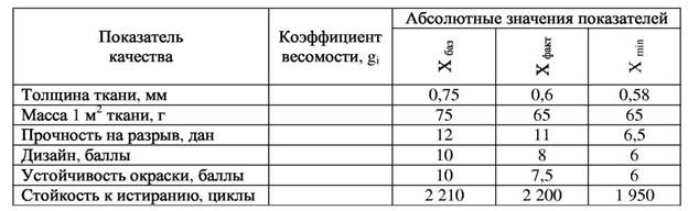 «Методи оцінки рівня якості товарів» Мета: поглиблення уявлень про методи оцінки якості товарів, придбання умінь визначення рівня їх якості. Завдання 1. Комплексним методом визначити рівень якості ситцю, значення показників якості якого вказані в таблиці 1. Зробити висновок про його відповідність установленим вимогам. Коефіцієнти вагомості показників якості визначити самостійно. Таблиця 1 - Показники якості ситцю