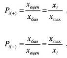 Методика рішення: В першу чергу визначають відносні значення показників. Вибір формули, що застосовується для розрахунку, залежить від впливу показника на якість об'єкта в цілому. Він (вплив) може бути «позитивним» і «негативним». «Позитивним» визнається показник, який при збільшенні абсолютного значення призводить до підвищення якості в цілому. Наприклад, чим вище оцінка за показником «Дизайн», тим краще в цілому якість об'єкта. «Негативним» буде показник, який при збільшенні свого абсолютного значення призводить до зниження загальної якості. Наприклад, чим вище рівень шуму пилососу, пральної машини, холодильника, тим це гірше для споживача. Для зручності в першій графі таблиці 2 відзначається вплив показника знаками «+» (позитивний) і «-» (негативний). Відносні показники - Pi - розраховуються: при «позитивному» вплив показника за формулою (1), при «негативному» - за формулою (2):