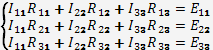 У цьому методі приймаємо, що у кожному контурі тече незалежний від суміжних контурів електричний струм, а струми віток визначаються алгебраїчною сумою струмів контуру, що розглядається, і суміжних контурів, для яких вітка є загальною. Система рівнянь контурних струмів I11, I22, I33 у загальному вигляді для схеми з трьома незалежними контурами має вигляд: