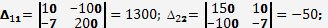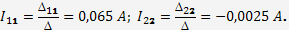 де R11 = R1 + R3 = 150 Ом – власний опір першого контуру; R22 = R2 + R3 = 200 Ом – власний опір другого контуру; R12 = R21 = -R3 = -100 Ом – опір суміжної вітки між 1 і 2 контурами. Знак мінус ставиться у тому випадку, коли контурні струми течуть через опір назустріч. E11 = E1 = 10 B – контурна ЕРС 1-го контуру; E22 = -E2 = -7 B - контурна ЕРС 1-го контуру має знак «мінус», оскільки напрям дії ЕРС протилежний напряму контурного струму. Підставляємо цифрові значення у систему рівнянь і розв’язуеємо її: