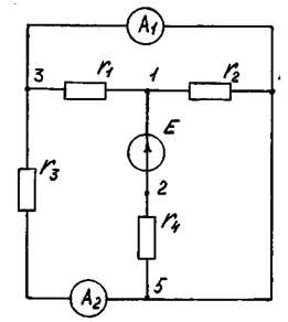 Розв'язання. Можна вважати, що опори амперметрів приблизно дорівнюють 0, тому точки 3, 4, 5 мають однаковий потенціал j3 = j4 = j5 і їх доцільно з'єднати в один вузол. Беручи до уваги, що напруга на резисторі r3 U35 = j3 - j5 = 0 i струм через r3 не тече, вітку з резистором r3 можна вилучити i накреслити нову спрощену розрахункову схему відносно затискачів джерела (рис.10).