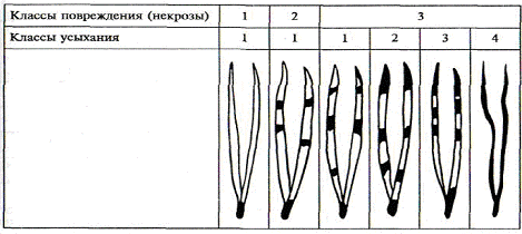 Классы повреждения: 1 – хвоинки без пятен; 2 – хвоинки с небольшим числом мелких пятен; 3 – хвоинки с большим числом черных и желтых пятен. Классы усыхания: 1 – на хвоинках нет сухих участков; 2 – на хвоинках усох кончик 2 – 5 мм; 3 – усохла 1/3 хвоинки; 4 – вся или большая часть хвоинки сухая.