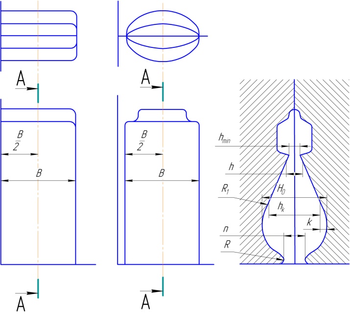 а) б) Рисунок 21 – Подкатные ручьи: а – открытый, б - закрытый Ширина открытого подкатного ручья, мм: б) для заготовки, не подвергавшейся предварительной протяжке (подкатка заготовки из сортового металла)