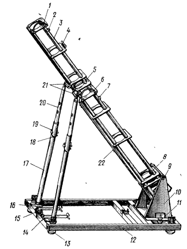 Рис. 10.5. Направляющая и основание: 1 и 6 – ножи; 2, 7 и 8 — розетки; 3 — труба; 4 — прицел; 5, 9 и 21 – оси; 10 – подставка; 11 – винт; 12 — рама основания; 13 — опора; 14 — подпорка, 15 — палец; 16 - кронштейн; 17 — штанга; 18 — стальной канатик пружинного шплинта; 19 — палец; 20 — внутренняя труба штанги; 22 — пружинный зажим