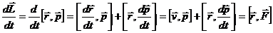 Первое слагаемое обращается в нуль в силу свойств векторного произведения, т.к. вектор скорости параллелен вектору импульса. Таким образом
