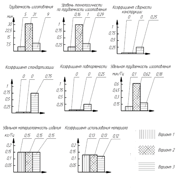 Рис. 19 Значения коэффициентов технологичности для конструктивных вариантов подшипникового узла