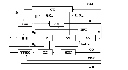 Рис. 1.3 Принятые сигналы с АС подаются на суммарно-разностный мост, в котором образуются суммарный US и два разностных UD сигнала (на рис. 1.3 показан только один из разностных сигналов). Эти сигналы усиливаются и фильтруются в приемно-усилительном тракте ПУТ, который содержит широкополосный ШТ и узкополосный УТ тракты. Первый из них служит для усиления импульсных сигналов и имеет три канала для усиления суммарного и двух разностных сигналов. Суммарный сигнал с входа ШТ направляется на канал ОДЦ, на измеритель дальности ИД и УТ, входящий в состав канала скорости. Кроме того этот сигнал вместе с разностными подается на фазовые детекторы ФД – выходные устройства дискриминаторов каналов измерения угловых координат (на рис. 1.3 показан только один ФД). Сигналы, содержащие информацию о угловом рассогласовании равносигнального или равнофазного направления АС и направления на цель, через УУДН поворачивают ДНА в сторону цели. Данные о азимуте a и угле места b цели снимаются с УУДН. Дальность измеряется импульсным методом, для чего в ИД подаются с СЧ опорные (модулирующие передатчик) импульсы. Информация о дальности используется в ЭВМ РЛ только при работе с низкой частотой повторения импульсов. Узкополосный тракт УТ выделяет из импульсного сигнала составляющую спектра с частотой Fпд + Fд, где Fпд – частота подставки, необходимая для сохранения знака доплеровского сдвига частоты. Информация о дальности R, скорости V и угловых координатах a и b, а также сигнал обнаружения СО подаются (обычно в цифровой форме) в ЭВМ РЛ, где вырабатываются сигналы управления самолетом и его оружием, управления режимами работы РЛ, а также поступающие потребителям информации ПИ. Эта ЭВМ вырабатывает, в частности, сигнал УС-1, служащий для управления частотой повторения зондирующих импульсов, и сигнал УС-2, используемый в режиме поиска цели. Структурная схема канала скорости. Упрощенная схема рассматриваемого канала показана на рис. 1.4. Образующийся в смесителе См-2 сигнал разностной частоты Fпд+Fд выделяется усилителем доплеровских частот УДЧ и подается на следящий измеритель частоты СИЧ. Построенный по схеме, показанной на рис. 1.4, следящий измеритель частоты практически эквивалентен оптимальному и для его расчета можно использовать соотношения, приведенные в ([2], с. 530-531). Для снижения влияния шума и помех на точность измерения частоты в СИЧ с помощью узкополосного фильтра УПФ осуществляется фильтрация сигнала перед подачей его на частотный дискриминатор ЧД. В целях облегчения узкополосной фильтрации частота сигнала повышается (например, до fн=500кГц). На частоту fн настраиваются УПФ и ЧД. На смеситель См-3 вместе с сигналом с выхода УТ поступает сигнал управляемого генератора УГ, частота которого fу.г является функцией управляющего напряжения Uупр, снимаемого с экстраполятора Э.