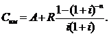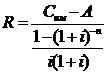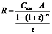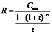 де n – термін лізингу в місяцях (кварталах, роках) – загальне число платежів (як правило дорівнює числу раз нарахування відсотків); i – процентна ставка за період (норма прибутковості лізингодателя), якщо зазначено номінальну річну ставку j, то у формулі замість i використовується величина j/m. Для спрощення розрахунків розмірів платежів часто використовують коефіцієнти розстрочки платежів (а), що визначають частку вартості устаткування, що погашається при кожній виплаті: