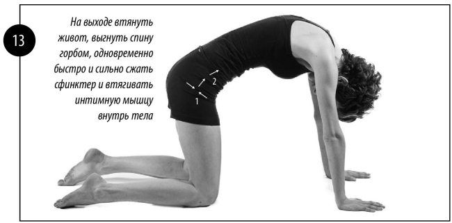 Делаем мощный выдох через рот, затем мощный вдох через нос, затем длительный и мощный выдох через рот, втягиваем живот под ребра, одновременно с втяжкой живота выгибаем спину, как у разъяренной кошки, очень сильно зажимаем вагинальный сфинктер и подтягиваем вагинальную мышцу кверху, насколько это возможно. Подтяжку вагинального сфинктера необходимо выполнять одновременно с втяжкой живота, как это показано на рисунке 13.