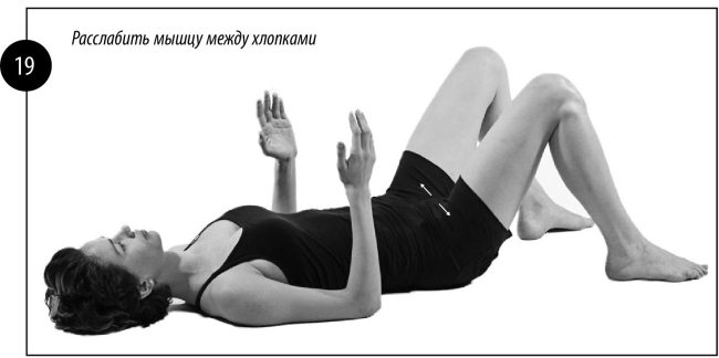 Упражнение выполняется в исходном положении лежа, руки сложены, как для аплодисментов, ноги слегка согнуты и раздвинуты в стороны. Начинаем сильно хлопать в ладоши, одновременно начинаем сильно сжимать вагинальную мышцу, как это показано на рисунках 18 и 19. Продолжительность выполнения упражнения две-три минуты.